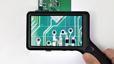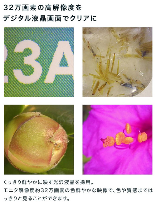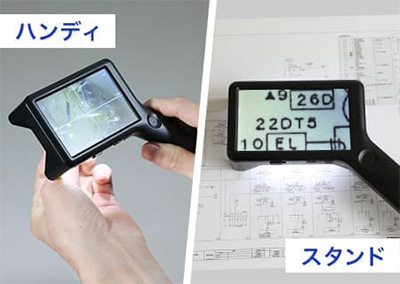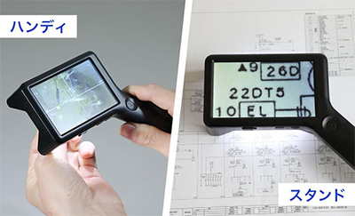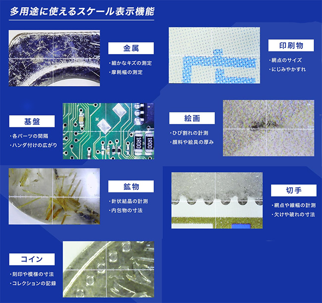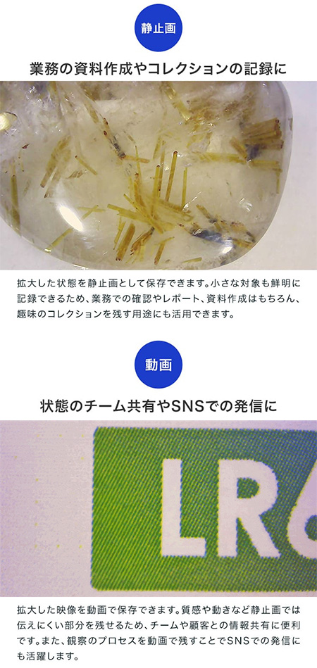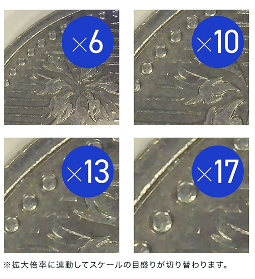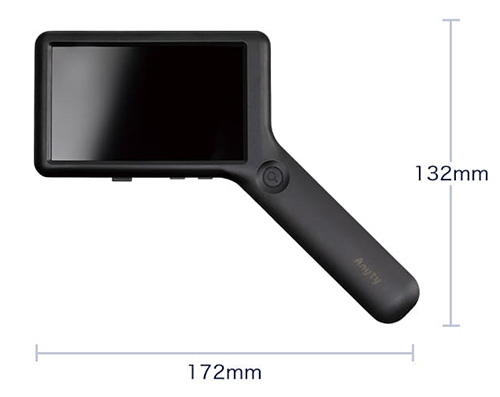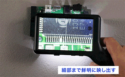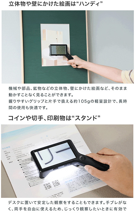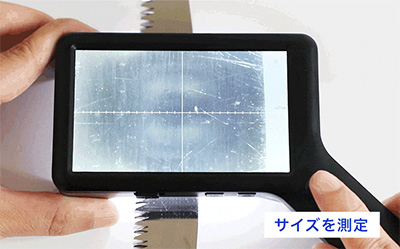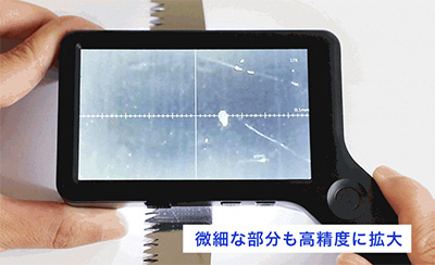 | 拡大しながら、同時に対象の大きさを簡易計測できる、携帯型デジタル顕微鏡。 手持ちでもスタンドでも使える2WAY設計で、現場での検査や細部確認をスムーズに行えます。 4インチの大画面と調光式LEDが細かな差をくっきり映し出し、非接触での観察にも対応。 軽量約105gのコードレス設計で、精密機器の検査から宝石鑑定、クラフト鑑賞まで幅広く活躍します。 ![]() ■製品概要 ●2種類のスケールで簡易測定 スケールとグリッド、対象物に合わせて切り替え可能。 位置合わせからサイズの確認まで、観察・測定をサポートします。 ![]() ●4インチ大画面モニタ 刃物、金属、半導体などの細部を拡大して大きく映す、大画面モニタ。 細かなキズや細部も大きく鮮明に観察できます。 ![]() ●ハンディでもスタンドでも その場でさっと手持ちで確認。 じっくり見たいときはデスクに固定して観察。 ひとつで二役、シーンに合わせて使い分けできます。 ![]() ■特長 ●スケール表示機能 拡大倍率に連動してスケールを表示。 拡大しながら、同時に対象の大きさを簡易計測することができます。 測定器に持ち替えることなく計測できるためスムーズです。 ![]() ![]() ●4インチ大画面モニタ 虫眼鏡やルーペでは見落としがちな細部も、4インチの大画面モニタなら、大きく鮮明に見ることができます。 ![]() ![]() ●最大17倍ズーム 光学ズーム6倍とデジタルズームを組み合わせ、最大17倍までの拡大が可能。 ボタンひとつで、6倍・10倍・13倍・17倍の、4段階に倍率を切り替えられます。 ![]() ![]() ●ハンディでもスタンドでも その場でさっと手持ちで確認。 じっくり見たいときはデスクに固定して観察。 ひとつで二役、シーンに合わせて使い分けできます。 ![]() ![]() ●静止画・動画撮影 拡大した様子を静止画・動画で撮影。 撮影したデータは自動的にSDカードに保存されます。 ![]() ![]() ■比較や記録に便利な「グリッド表示」 対象を中央に合わせたり、複数の対象を比較するときの基準として役立つ「グリッド表示」。 位置のズレを防ぎ、安定した観察や撮影が可能です。 ![]() ■寸法図 ![]() ■仕様