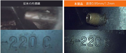 | 直径0.95mm•1.2mmの超極細径で鮮明な画質を実現。 最新のCMOSセンサを搭載した有効長0.5m、1mの工業用内視鏡です。 「細径は画質が落ちる」イメージを払拭する16万画素。 メーカー従来の細径内視鏡に比べノイズが少なく、クリアに映し出します。 ![]() ■狭所の観察に対応した超極細径0.95mm 細いパイプなど狭所の観察に。柔軟なケーブルが奥まで入り込み、傷や不良を発見します。 超極細径1.2mmに加えて、より細径化した0.95mmが新たに登場。 さらに狭いスペースや微細な穴にも対応可能です。 ![]() ■メーカー従来の極細径に比べ圧倒的に見やすい16万画素 直径1.2mmは最新のCMOSセンサを搭載。 極細径の解像度は4万画素が多い中、IFIBERは16万画素のカメラ解像度を実現しました。 ノイズが少なくクリアな映像で、今まで見づらいと感じていた場所の観察もはっきり見ることができます。 ※カメラ解像度は先端径によって異なります ![]()