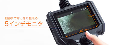 ■ハンディ型内視鏡で最大クラスの5インチモニタ 小さなモニタを見続けることで目に大きな負担がかかります。不具合の判断がつきづらく、検査に時間がかかってしまうことも。 IFIBERは、ハンディタイプの工業用内視鏡で最大クラスの5インチモニタ。 目の負担を軽減して作業効率を高めます。 ※映像は直径2.4mmです。径によって表示範囲が異なります。 ![]() ■HDMI出力対応 外部モニタで複数人と共有できる 付属のHDMIケーブルを接続するだけで映像を別のモニタへ映し出すことができます。 大画面での検査はより見やすく、検査効率の改善や会議など複数人での共有、クライアントへの説明にも役立ちます。 ![]() ■検査効率を高めるさまざまな機能 最適な明るさを選べる8段階の調光機能 8段階調光機能で、検査場所に適した明るさを選べます。 直径0.95mm•1.2mmは光ファイバーを採用しています。 ■一度に広範囲を確認できる視野角100度 工業用内視鏡の視野角は45~80度が一般的です。 IFIBERは100度の視野角で一度に広範囲の確認が可能。 作業スピードが向上します。 ![]() ■強度に優れたステンレスケーブル 内部の状況がわからない場所で使用することが多い内視鏡は、汚れや障害物などでケーブルを傷めてしまう可能性があります。 直径0.95mm•1.2mmケーブルは汚れが落ちやすく、優れた強度を持つ「ステンレス素材」を採用。 超極細系に適した材質です。 ![]() ■見やすさを向上する3つの補助機能 一時停止確認ができる「映像ロック機能」 点検中は不具合箇所を見逃さないために、注意深く観察する必要があります。 IFIBERは点検中の映像を一時停止することができる映像ロック機能を搭載。 ボタンを押すだけで映像を停止でき、じっくり確認することができます。 ※右画像は直径2.4mmの映像です ■小さな傷も拡大して確認できる最大5倍の「デジタルズーム機能」 小さな傷やバリを検査したいときはデジタルズーム機能が便利です。 ボタンを押すだけで最大5倍に拡大できます。 ※拡大した状態では撮影できません ![]() ■見やすい位置を保持できる「映像反転機能」 見やすい向きに反転させ映像を表示することができます。反転はボタンを押すだけ。 かんたん操作でスムーズな検査が可能です。 ※右画像は直径2.4mmの映像です。 ■使用事例 自動車・航空・鉄道・船舶業界、製造業界、建設業界など幅広い分野で活用できます。 ![]() ●自動車部品、ドア、エンジン部分の検査。細い管や穴の内部観察。 「バリ」「ピンホール」「傷・亀裂」の特定など。 ●熱交換機や各種プラント内部の配管、配管の継ぎ手のサビ、詰まり、腐食、穴の観察。 空調、エアコン、ダクト内部の点検や清掃前後の点検、製造機器やタンク、配管等のメンテナンスなど。 ●機器・部品検査、品質管理、精密機器内部の検査、内部配線の確認。 金型、鋳物の巣穴検査、バルブの検査、ピンホールやブローホール、異物、傷、亀裂の検査など。 ■場所に合わせて選べる豊富な先端径・有効長 超極細径の0.95mm•1.2mmから、先端可動タイプの1.8~6.0mmの先端径、有効長0.5~10mの充実したラインアップを展開しています。 先端径によって仕様が異なりますので、ご不明点はお気軽にお問い合わせください。 ![]() ■サイズ ![]() ■付属品/内容物 ・製品本体 ・MicroSDカード(テスト用) ・USBケーブル ・カードリーダー ・HDMIケーブル ・充電器 ・クリーニングクロス ・簡易スタンド ※簡易スタンドはフレキシブルに高さを調整できます。 ![]() ![]() ■バッテリ部は取り外して充電可能 取り外し可能な充電バッテリ式を採用。 バッテリ部だけで充電でき場所を取りません。