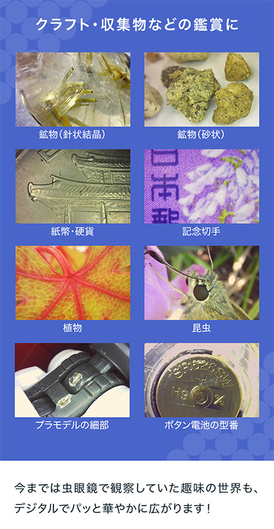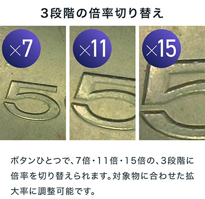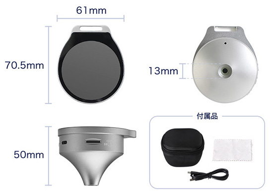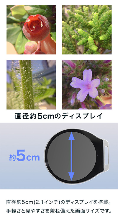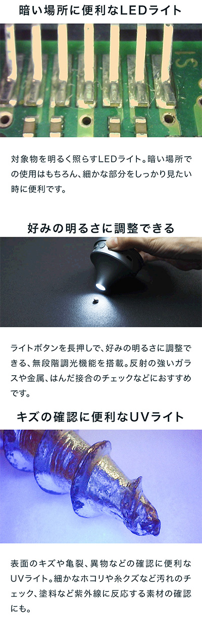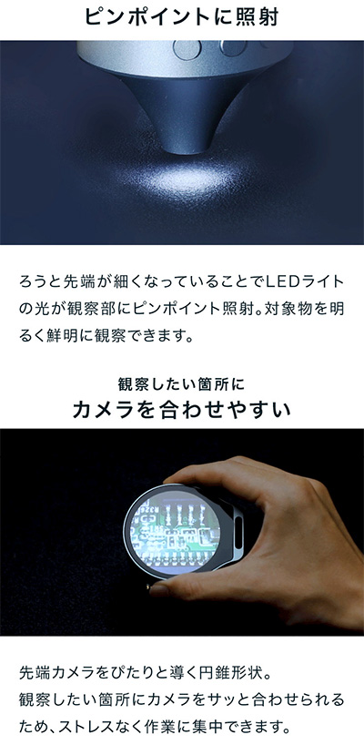 | 角やくぼみにフィットする、ろうと型デザインの携帯型LED顕微鏡が登場。 従来は見えづらかった曲面や凹凸面も鮮明に映し出し、観察・確認作業をスムーズにします。 ディスプレイにはコントラストに優れた光沢液晶を採用し、色や質感の違いまでくっきり表示。 撮影・保存したデータはチーム内での共有や報告資料の作成に役立ちます。 ![]() ■製品概要 ●ろうと型の形状がフィット 見えにくかった曲面、凹凸面も鮮明に拡大 くぼみやすき間にフィットする先端形状で、平面拡大鏡ではピントが合わず見えづらかった、曲面、凹凸面の確認作業がスムーズにおこなえます。 ![]() ●最大15倍ズームで 微細な部分も高精度に拡大可能 ボタンひとつで対象物に合わせて7倍・11倍・15倍に倍率の切り替えが可能。 微細な部分も精密に見ることができます。 ![]() ●高コントラストの光沢液晶で質感まで見える 鮮やかでくっきりと表示する光沢液晶を採用。 モニタ解像度約23万画素の色鮮やかな映像で色や質感の違いまで鮮明に映し出します。 ![]() ■特長 ●曲面、凹凸面の観察ができるろうと型デザイン。 平面だけじゃない! ななめ視点も鮮明に見える。 平面だけでなく、ななめ視点からの観察でも、鮮明な映像を映します。 これまでの平面拡大鏡ではピントが合わず見えづらかった、曲面、凹凸面の観察や確認作業もスムーズにおこなえます。 ![]() ![]() ●最大15倍ズーム!微細な部分も高精度に拡大 光学×デジタルズニム最大15倍の迫力。 光学7倍とデジタルズームを組み合わせ、最大15倍まで拡大可能。 微細な部分も精密に見ることができます。 ![]() ![]() ●質感までくっきり。高コントラストの光沢液晶 約23万画素の、色鮮やかな高コントラスト。 鮮やかでくっきりと表示する光沢液晶を採用。 モニタ解像度約23万画素の色鮮やかな映像で細部まで鮮明に映し出されるため、色や質感の違いをはっきりと見ることができます。 ![]() ![]() ●用途に合わせて調光できるLED/UVライト。 ![]() ![]() ●映像を撮影して観察、そのまま保存できる。 シャッターボタンで静止画を撮影。 映像を撮影し、プレビュー画面で静止画を確認。 撮影したデータは自動的にSD力一ドに保存されます。 (もう一度シャッターボタンを押すまで、約5分間プレビュー画面が表ホされます) ![]() ■パソコンカメラモード パソコンに接続して大画面で観察できる。 付属のUSBケーブルでパソコンと接続。 パソコン標準搭載のカメラアプリなど、外付けカメラを認識できるアプリを使って、大画面で観察・撮影・保存することができます。 ※撮影はパソコンのカメラアプリを使用します。 ![]() ■スマホ・タブレットで撮影した画像を見る スマートフオンやタブレットに接続して撮影した画像を画面で見る。 USB Type-C端子を備えたスマートフォンやタブレットに接続して、撮影した画像をその場で確認・共有できます。 パソコンを持ち歩かなくても、外出先で手軽に使えて便利です。 ※本製品にはType-C to Cケーブルが付属しておりません。 ※データ転送に対応したType-C to Cケーブルを事前にご用意ください。 ※リアルタイム画像をご覧いただくことはできません。 ![]() ■専用ケース付きで持ち運びも便利 ![]() ■こんなシーンでも! ![]() ■寸法図 ![]() ■仕様