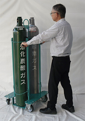 軽量小型、女性でも自在に動き移動もスムーズ![]() ■特長 ●四輪縦積で安定性抜群、転倒防止安全第一 ●多目的の使用に小型・軽量で便利 ●用意入替は低床構造で楽 ●一般ガスボンベ47L容器全てに共通 ![]() ■仕様