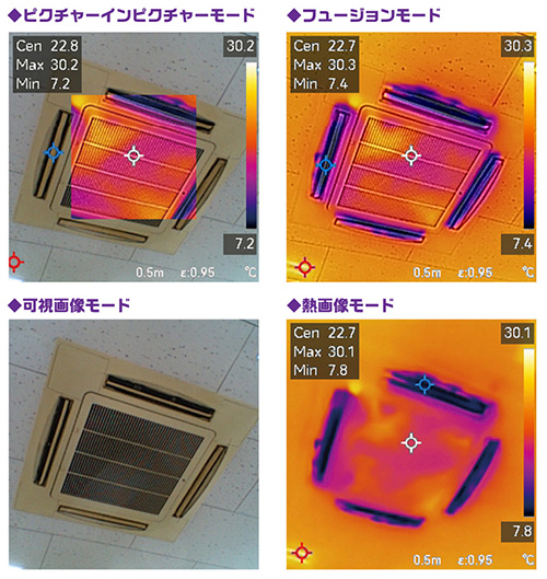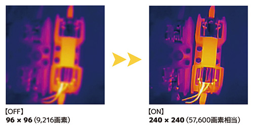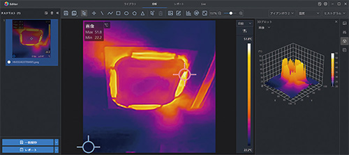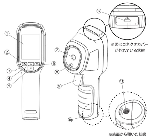 片手で持ちやすいハンドグリップタイプ![]() ■特長 ●熱画像に加え可視画像も撮影可能。さらに2つを重ねた融合画像も表示可能でホッ●トスポットやコールドスポットが実対象物のどの部分にあたるかを把握しやすい。 ●Enhanced IR機能(熱画像のソフトウェア処理)により96×96(9,216画素)の熱画像を240×240(57,600画素相当)の解像度にアップスケール可能 ●内蔵の大容量バッテリにより最長約8時間の連続使用が可能 ●2mの落下耐性および、防塵・防水性能IP54準拠 ●Windows用ソフトウェアでデータの管理、編集、レポート作成が可能 ※三脚は付属しません。 ■4種類の画像モード 用途に合わせて、4種類の画像モードを切り替えてご使用できます。 トリガーボタンを引いて撮影するだけ! 温度情報つきの画像データ(.jpg)が自動で保存されます。 ![]() ■独自の画像処理テクノロジー EnhancedIR機能(熱画像のソフトウェア処理)により96×96(9,216画素)の熱画像を240×240(57,600画素相当)の解像度にアップスケール ![]() ■スケジュール撮影機能 指定した間隔、回数で自動撮影をします。 ※このスケジュール撮影中はオートスリープ、オートパワーオフの機能は無効になり、撮影完了時から機能します。 ■WindowsPC専用ソフトウェア ![]() ●付属のUSBケーブルで接続して本体のデータをアップロードすると、データのチェックや編集ができます。 ●熱画像の編集、解析ツール機能を多数搭載 ①表示モードの変更 ②画像内の温度確認 ③各種補正機能 ④温度グラデーションの色変更 ●レポート作成機能付きで簡単なPDFレポートの編集&出力 ■PC側標準カメラアプリとの連動 ●付属のUSBケーブルで接続してMB8SA-13Gで撮影している映像をPC上にリアルタイムで共有 ●PC側標準カメラアプリの機能を使用して共有映像の静止画・動画を保存 ※ご使用のPC側標準カメラアプリの仕様・バージョンによっては本機能が利用できない・できなくなる場合がありますのでご了承ください ※PC側標準カメラアプリ上に表示される映像は本体画面のアスペクト比とは異なります。 ■各部名称 ![]() ①画面表示部 ②充電インジケータ*2 ③電源ボタン ④「▲」上ボタン ⑤「▼」下ボタン ⑥戻るボタン ⑦赤外線カメラ ⑧可視光カメラ ⑨トリガーボタン ⑩ストラップ取り付け穴 ⑪三脚穴※三脚は付属していません。 ⑫USB Type-Cコネクタ *2 赤色点灯:充電中、緑色点灯:充電完了 ■仕様 ●温度