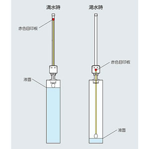 | 残液量がすぐわかる、手軽なフロート式簡易型レベル計。 警報機※は任意の位置に固定でき、さらに使いやすくなりました。 警報機は渇水時に表示器の赤色LEDが点滅します。 さらに、外部警報接点による遠方での監視もできます。 パイプ上部に赤色の目印板があり、遠くからでも目視が可能です。 警報機※を設置すると、夜間でも液量を監視できます。 ![]() ■赤色目印板の位置が調節できます。 ■防波管は市販の塩ビ接手やパイプで簡単に設置することができます。 ■黄色のパイプが液面と共に上下し、先端の赤色目印板で液面を 確認することができます。 標準品は目視確認のみとなります。 ■タンクに合わせて現場で液面調整ができます。 (H760mm以下のタンク) ■O-リングはアルカリ用のEPDM製と酸用のバイトン製の2種類が選択できるため、さまざまな液体に対応します。 ■撹拌機作動時の誤作動を防止する、防波管もオプションにてご用意いたします。 ■警報機(MC6L-913KS) ※オプション ●警報機(MC6L-913KS)を設置すると夜間でも液量の監視ができます。 液体がある場合は青色LEDが点灯し、渇水になると赤色LEDが点滅します。 さらに、外部警報接点による遠方での監視も可能です。 ●警報機(MC6L-913KS)は任意の場所に設置することができます。 警報機を標準(下限位置)以外に設置する場合は、別売りのストッパーパイプにて位置決めを変更する必要があります。 ■タイプ