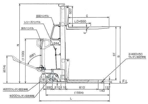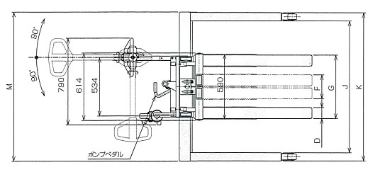 ■電動式シリーズのおもな特長 ●楽々簡単操作のバッテリー式のリフターです。 ●操舵用車輪が押ハンドルと一体になっているので方向転換が容易 ●ソフトタッチのレバースイッチで昇降楽々操作 ●上昇時の衝撃を極力抑えた安全設計 ●ゴルフカート用の長寿命”EB”バッテリーを搭載 ●自動充電器搭載でいつでもどこでも充電OK(AC100V) ●充電器のコード(2m)はひきずる心配のない自動巻き取り式です。 ●1回の充電力は最大積載荷重で連続30回上下出来ます。 ●見やすいバッテリー残量計付き ●過負荷防止装置付き※1 ●PCフローコントロール(積載荷重が変化しても、下降スピードを一定に保ちます。) ●充電時間は約12時間。気温やバッテリーの古さなどで充電時間は変わります。 ●フル充電は最大積載荷重で連続30回上下できます。 ※1.荷重オーバーの時は上昇しません。 ■スプリングの力でレリーズハンドルが戻る為、緊急時には手を放すだけで下降しているフォークが止まります。 注)リフト上昇は、レリーズハンドルを締めて行ってください。 ![]() ■寸法図 ※パレットトラックではすくえない両面パレットをすくい運搬できます。 ![]() ![]()