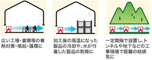 広い工場、倉庫、体育館などの暑熱対策・換気・循環に。