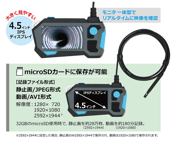| 360度回転のデュアルカメラ搭載により前方+側面 同時確認が可能 静止画・動画の記録に。 ![]() ■特長 ●360度回転のデュアルカメラ搭載により、前方+側面の同時確認が可能です。 ●IP68仕様のケーブルで、曲がった管の中も確認、撮影ができる工業用内視鏡です。 ●大きく見やすい4.5インチIPSディスプレイを採用しています。 ●カメラはIP68相当の防塵防水性能を備え、耐油性能もあるため、厳しい環境下の観察にも安心して使用できます。 ●2592×1944の静止画、1920×1080の動画をmicroSDに保存が可能です。 ●カメラ前方、側面をそれぞれ照らす白色LEDで暗い管内でも明るく照らしながら記録します。 ■カメラはIP68相当の防塵・防水性能 耐油性能もあるため厳しい環境下の観察にも安心して使用できます。 ![]() ![]() ■材質 ・本体:プラスチック ・ケーブル:プラスチック ■曲がった管の中も確認・撮影ができる工業用内視鏡 360度回転デュアルカメラ内視鏡 ![]() ■仕様