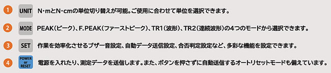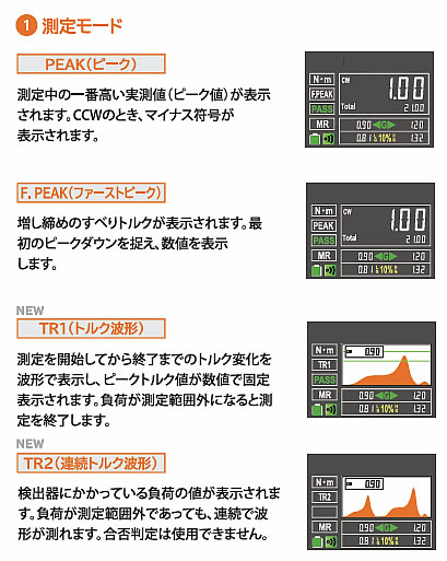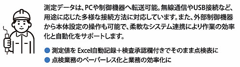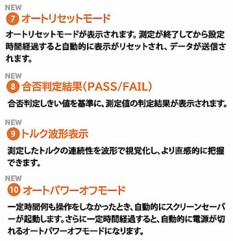 | トルク計測器は世界の標準器です。 1970年、トルク管理の概念が存在しない時代、私たちは世界で初めて、電流制御によりダイヤル式で精密なトルクコントロールが可能な産業用電動ドライバーを開発しました。 1977年には正確なトルクを自動で制御するオートクラッチ式ドライバーを発表し技術革新を遂げました。 翌年には、ねじ締め品質管理の向上を追求し、トルク計測器の開発に着手。 ファイダプターの機構は私たちが開発したもので、クラッチ式電動ドライバーのトルク測定時の慣性(イナーシャ)の影響を緩和し、正確なトルク値の検出を可能にしました。 ねじ締め品質管理の基準が確立され、新たな革新がもたらされました。 現在、トルク計測器は世界90カ国 以上のモノづくり現場で使用されています。 ![]() ■ワイヤレスにデータを送受信 シリーズ初のトルクデータ転送機能を標準搭載。 Bluetooth や USB でPC やPLC に接続し、測定デー タをリアルタイム送信。 責任者は自席で結果を確認· 承認でき、点検·記録作業を効率化します。 ■大型 3.5 インチディスプレイ採用 視認性に優れた大型ディスプレイを採用。 トルク値や波形、判定結果を一目で確認でき、作業者の判断ミスを抑え、安心·確実な作業を支援します。 ■測定モードが進化 4つの測定モード「ピーク値」「ファーストピーク値」「波形」「連続波形」を標準搭載。 リアルタイム波形表示で異常やばらつきを視覚的に把握し、精密かつ確かなトルク管理が可能です。 ■リモート操作で作業をスマートに モードの変更やしきい値の変更が外部機器から操作でき、より便利で効率的な作業が行え、作業の省力化· 省人化をサポートします。 ■PASS/FAIL 合否判定機能で安全なトルク管理 しきい値設定による PASS /FAILの自動判定に対応。 判定機能のON /OFF切替も可能で、用途に応じた柔軟なトルクチェックが行えます。 ■専用アプリケーションでデータ収集 データの記録·蓄積·管理を行う専用アプリを提供。 自動記録やワークフローでの確認·承認に対応し、業務効 率化·ペーパーレス化を促進。 機器情報もQR コードシステムと連携し、簡単に管理·追跡が可能です。 ■ねじの戻しトルクや増し締めトルクを可視化し、締め付けトルク管理の精度向上や分析をより高い次元でサポート。 測定·波形表示·データ管理まで対応した多機能トルクメーターです。 ■ディスプレイ トルク測定値を波形で表示し、合否判定の設定もディスプレイで視覚的に確認可能。 測定値や仕事量、トルク値などが分かりやすく表示され、作業効率向上をサポートします。 ![]() ![]() ![]() ■日常検査・承認におすすめ ![]() ![]() ■本体設定変更・CSV保存に対応 測定データの収集・蓄積 ![]() ![]() ■操作パネルの名称とはたらき 大型ディスプレイで高い視認性、操作性の向上はもちろん、合否判定やバッテリー容量、多彩な機能の追加により、作業効率が飛躍的に向上しました。 これまでにない使いやすさと機能性を兼ね備え、新しい作業スタイルを提案します。 ![]() ![]() ■外部出力 測定データをワイヤレス又は有線で外部機器と接続してデータを転送します。 ![]() ●通信設定パラメーター