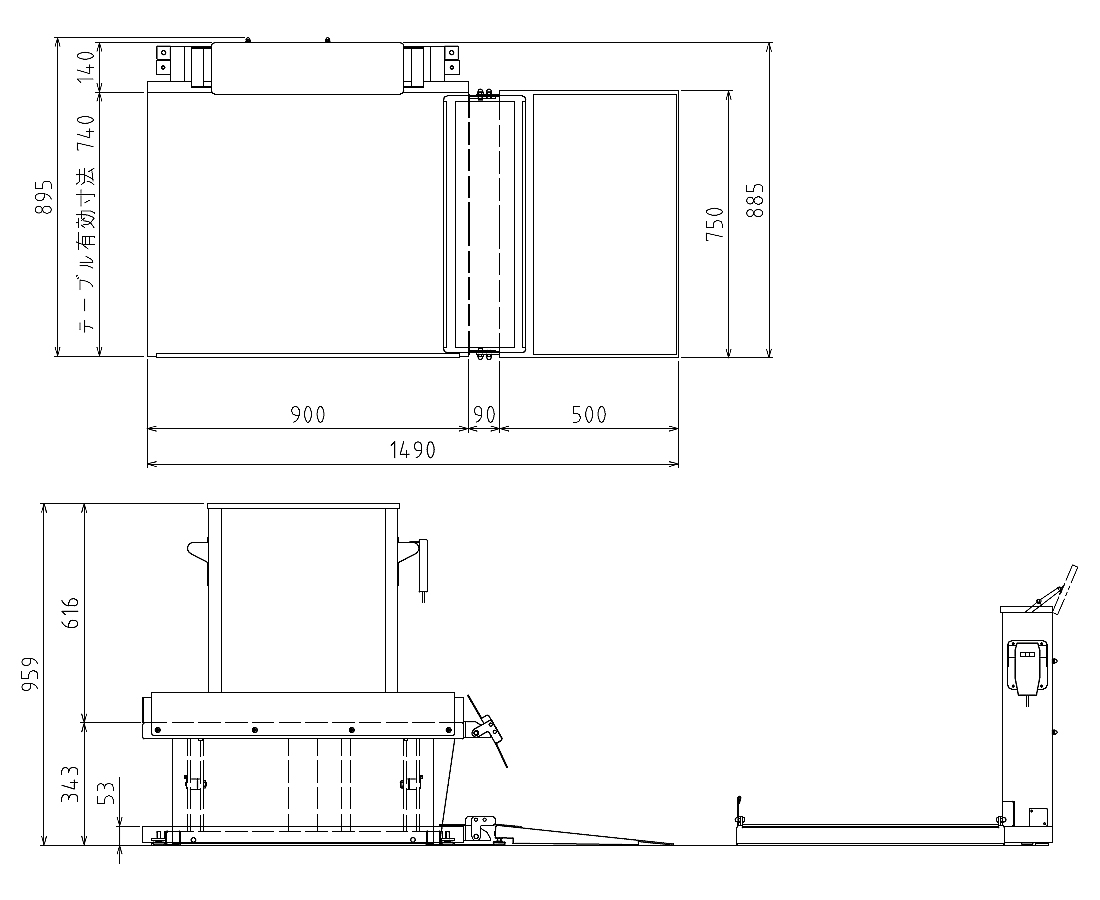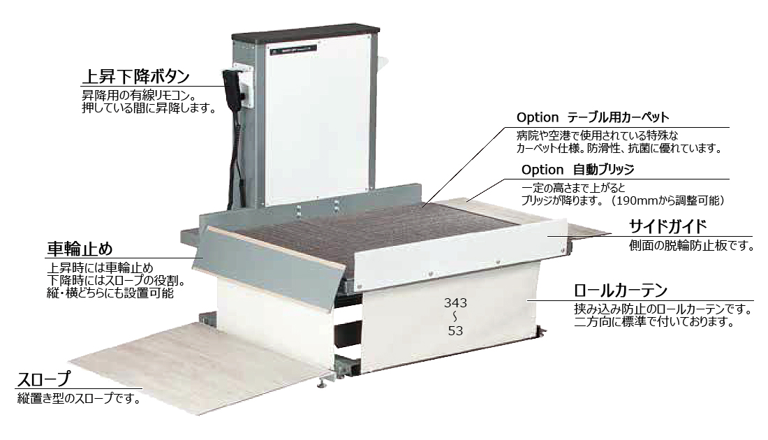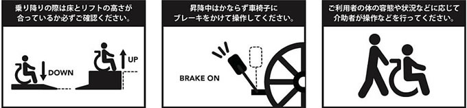 ■寸法図 ![]() ■乗り降りについての注意事項 (1)段差解消機への乗り降りの際はテーブルが下限の床位置、又は上限の床位置と同じ高さであるか確認した後に行ってください。 テーブルが下限位置又は上限位置に床の高さが合っていない場合に乗り降りすると車椅子ごと転落、転倒してしまい生命にかかわる重大事故となる恐れがあります。 (2)車止めの付いている段差解消機では車椅子で車輪止めに強く当たらないよう、乗り降りはゆっくり静かに行って下さい。 車椅子が車輪止めに強く当たると、車輪止めを乗り越えて車椅子ごと転落、転倒してしまい生命にかかわる重大事故となる恐れがあります。 (3)車椅子はテーブルの所定の位置に停止させ車椅子のブレーキを必ずかけ、停止状態をしっかりと確認して段差解消機を昇降させてください。車椅子が停止していないとテーブルを乗り越えて車椅子ごと転落、転倒してしまい生命にかかわる重大事故となる恐れがあります。 ■昇降中の注意事項 (1)昇降中は車椅子にブレーキをかけて、車椅子の停止状態を保持してください。 車止めの付いている段差解消機でも車輪止めだけに頼って車椅子の停止状態を保持すると、車輪止めを乗り越えて車椅子ごと転落、転倒してしまい生命にかかわる重大事故となる恐れがありますので、必ず車椅子にブレーキをかけて車椅子の停止状態を保持してください。 (2)身体、車椅子などはテーブルからはみ出さないようにして下さい。 身体、車椅子などがテーブルからはみ出すと段差解消機以外の他の物体に接触し、身体の怪我や車椅子ごと転落、転倒して しまい生命にかかわる重大事故となる恐れがあります。 (3)昇降中はテーブルを揺らさないよう静かに乗ってください。 テーブルを揺らすと段差解消機の故障につながり、生命にかかわる重大事故となる恐れがあります。 ■その他の注意事項 (1)ご利用者の身体の容態、状況などに応じて介助者による誘導、補助、操作などをお願い致します。 特にバックで乗り移りを行う際は必ず介助者の誘導をお願いします。 (2)段差解消機にテーブルの傾き、揺れ、沈み込み(自然降下)、異常音など何らかの異常がある場合には直ちに使用をやめ、メーカー又は販売店にご連絡ください。 使い続けますと生命にかかわる重大事故となる恐れがあります。 ![]() |