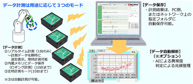 | 3軸加速度センサーを内蔵し、無線方式にWiFiを用いた無線振動計です。 約70mの距離での通信が可能です(※見通しが良い環境にて) オプションのルーターを使用することで、1台のPC・ソフトウェアにて最大100台の無線振動計との接続が可能。 ![]() ■特長 ●内蔵の3軸加速度センサーには静電容量方式のセンサーを搭載。 ●DC成分(重力加速度など)~100Hz程度までの周波数成分の加速度を検出可能。 ●リアルタイム計測にて、4kHzまでのサンプリング周波数に対応。 ●ロギング計測では、サンプリング周波数は最高20kHzまで対応。 ●外部センサーとして、ピックアップタイプの3軸加速度センサー(MA3シリーズ)の取付が可能。 ●応答周波数最高10kHzまで対応可能。 ●設備の兆候管理にて予防保全を実施するのに最適な『異常振動モニタリングシステム』など、オプションソフトウェアも充実。 ●リアルタイム計測機能により、現場で設備の状態がリアルタイムで確認可能。設備の状態がより確実に把握可能です。 ![]() ●WiFi方式なので1台のPCにて多数の振動計との接続が可能です。 ●最大で100台の計測が可能なので、より多くの計測ポイントを自動監視することができます。 ![]() ●センサを多数取り付けて自動定時計測を行うことで設備状態の監視が可能です。 ![]() ●巡回計測の手間が省けるので、工数削減にお役立ていただけます。 ●FFT解析機能などの解析機能により、設備振動の原因解析などにも有効です。 ![]() ■運用イメージ ![]() ■データ計測(用途に応じた3つのモードを搭載) ●定時計測モード(100台まで) 自動で計測が可能。設備の自動監視におすすめ。 ●リアルタイム計測モード(1台のみ) 計測データを瞬時に波形表示。常時計測も可能。 ●ロギングマニュアル計測モード(100台まで) センサー本体の内蔵メモリにデータを保存する計測モード。 計測ソフトウェアで計測開始ボタンを押して開始します。計測中に通信が途切れてしまう場所の計測も可能です。 ■データ保存 計測結果は、PC側、またはネットワーク上の指定フォルダに自動保存可能です。 ネットワーク上のフォルダを指定した場合、オプションの自動解析ソフトウェアを別の場所のPCでも運用することができます。 ■データ自動解析(オプション) Aiによる異常度判定による兆候管理を行います。通知機能で、異常を見つけた際にメールでお知らせします。 ■寸法図 ![]() ■セット