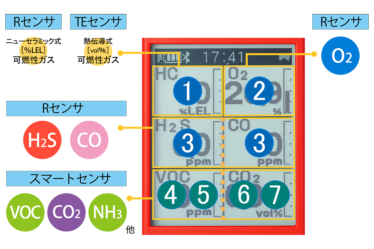 ●画面の自動反転 画面が自動で180度反転。表示の読み間違いを防止します。 ![]() ●警報点の設定変更 設定プログラムを用いて設定変更が可能。お客様の基準に即した管理・運用をサポートします。 ●コンファメーションビープ機能 ガス検知器が正常に動作していることを知らせる機能です。測定中、設定された間隔ごとにブザーが鳴ります。 ●校正お知らせ機能 電源投入後、定期点検推奨日までの日数を表示します。点検忘れを防止し、より安全にお使いいただけます。 ●連続使用時間 バッテリー切れの心配なく長時間の作業ができ、信頼性の高い安全管理をサポートします。 ■センサについて 搭載できるセンサは最大6種類をお選びいただけます。 搭載するセンサ、電源、Bluetooth®の対応/非対応、防爆仕様を、製品コード表を参考にお選びください。 ![]() ■センサの選択例 ![]() ■仕様