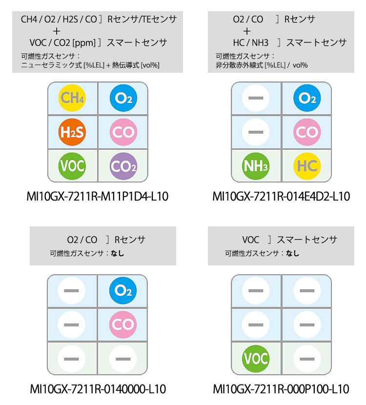 ※2:国内防爆仕様では、東芝製LR6T(JE) 3本を使用可能です。ATEX/IECEx仕様では、東芝製LR6T(JE) 3 本またはDURACELL製MN1500(3本)を使用可能です。 ※3:可燃性ガス(ニューセラミック式センサ)、酸素、硫化水素、一酸化炭素、VOC、二酸化炭素の6成分仕様の場合。搭載するセンサによって連続使用時間は異なります。 ※4:使用湿度範囲:搭載するセンサにより異なる場合があります。 ※5:MI10GX-7200R-77738またはMI10GX-7200R-77739にて東芝製乾電池を使用した場合。MI10GX-7200R-77739にてDURACELL 製電池(MN1500)を使用する場合、温度等級はT3になります。 ■仕様 ※ここで表示されている品番は一例です。掲載されていないセンサー組合せを希望される場合は、搭載するセンサ、電源、Bluetooth®の対応/非対応、防爆仕様をご指定の上、メールをお送りください。