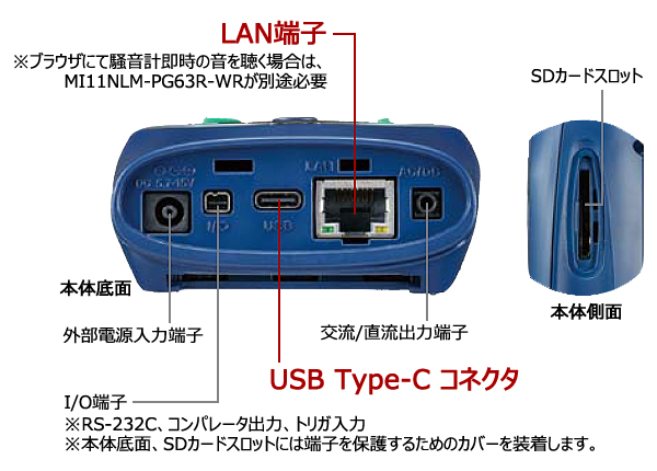 また、ハードウェア構成が簡単で、コンピューターと騒音計を接続する場合、測定機への給電、通信制御、SDカードに保存された測定データ回収がUSB Type-C ケーブル1本で実施可能です。