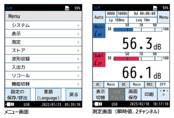 測定レベル範囲 A特性:25dB~138dB、C特性:33dB~138dB、