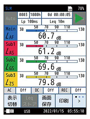 4条件の異なる周波数重み付け特性、時間重み付け特性を設定し、演算値を保存可能。