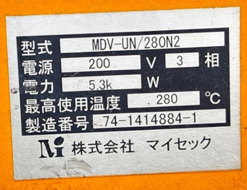中古マイセック製200Lドラム缶用ヒーター底側面加熱タイプ 品番 MDV-UN-280N2 問合せ番号 Z-01067-3 |