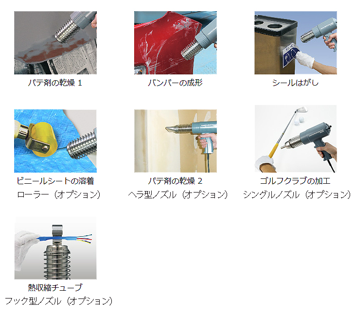 | 高温・高風速タイプの工業用ドライヤー 熱量が必要な用途におすすめ メーカーで一番の風量を誇るモーターを採用 ![]() ■特長 ●熱量が必要な用途にお勧めな工業用ドライヤー ●メーカー他機種の3倍以上の風速を誇るモーターを採用 ●500℃の最高温度を実現するヒーターを採用 ※作業後は20秒以上、収納時は5分以上クールダウンします。 ![]() ■用途例 使用できる素材 パテの乾燥、収縮チューブの熱収縮、シールはがし、ビニールクロスの溶着、床施工作業、塩ビ加工の曲げ加工、樹脂の熱硬化、金属類への加熱 ![]() ■使用方法 / 使用例 1)スライドボタン(スイッチ)をOFFにして12A以上のコンセントに電源プラグを差し込みます。 2)スライドボタンを押して、HOTにすると熱風がでます。 3)作業が終わったら、スライドボタンを COLD に切り替えて20秒以上クールダウンします。 ※収納時は5分以上クールダウンし、本体が冷却されたことを確認します。 ■仕様