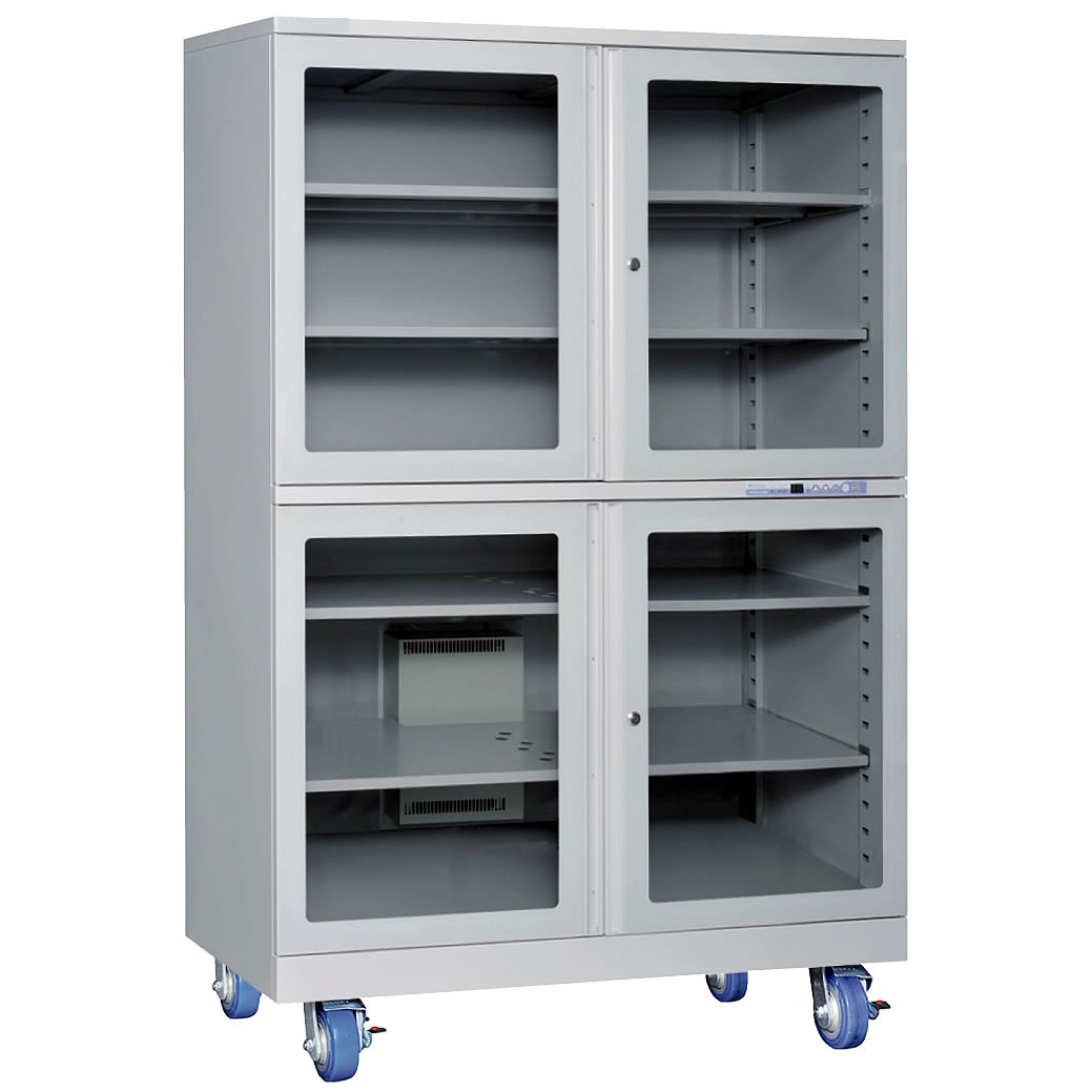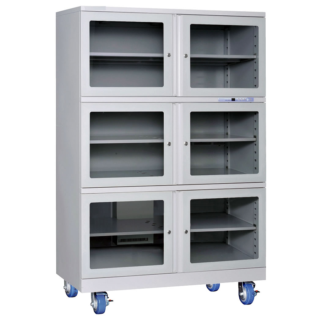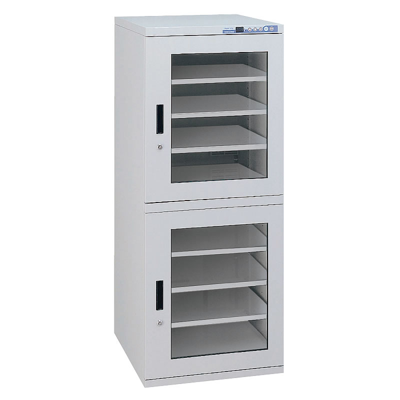 | 全自動超低湿保管庫です。 メーカー独自開発の電子ドライユニットとマイコン制御【特許 第5449309号】により省エネかつ、強力で安定した低湿環境を実現。 電子ドライユニットは、日本の自社工場で製造しており、耐久性の高さも強みになっています。 万が一の故障時もメーカーのエンジニアが迅速にサポートいたします。 1回の加熱再生で1%RH以下を長時間持続可能です。 設定湿度に対し精度±3%RH(加熱再生時を除く)です。 部品・部材の品質保持・長期保管に最適です。 ![]() ■標準仕様 ●静電容量式センサーと高精度マイコン制御【特許 第5449309号】により 高精度で検知した庫内湿度を1%刻みで安定制御 ●扉を開けずに1%刻みで湿度設定が可能なデジタルパネルを採用 ●6時間毎に加熱再生する連続運転モードを搭載 ●プリント基板管理基準 IPC-1602に準拠 ●ICパッケージ管理基準 IPC/JEDEC J-STD-033Dに準拠 ●1MΩのアース線を装備 ●導電性焼付塗装(本体、棚) ●静電気対策はESD-IEC61340-5-1に準拠 ●部品は欧州RoHS2に対応 ■デジタルパネル ■各部名称