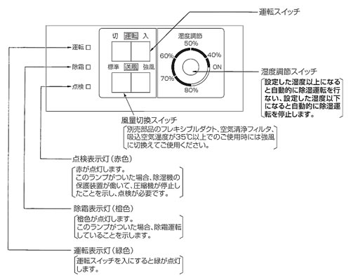 | 室温が1~45℃の範囲でご使用下さい。 これ以外の温度で運転を続けますと、保護装置が作動して運転を停止したり、正常な運転ができなくなります。 ![]() ■除湿運転について 温度が低くなるにつれて、除湿量は図のように少なくなります。 また、温度、湿度によっては、熱交換器の一部が結露しないことがあります。(異常では有りません) ■運転中は室内を加温します。 除湿機には、冷房能力はありません。 除湿機の吹出空気温度は、吸込空気温度より10~20℃高い温度になります。 ■除霜運転について 吸込空気温度が、約20℃以下になりますと熱交換器に着霜し、自動除霜を繰り返しながら除湿運転を行ないます。 また、除霜運転中には風が出なくなりますが、これは霜取りを行なっているため、故障ではありません。 (除霜表示灯が点灯します。) 霜取りの頻度は、そのときの温度と湿度によっても異なりますが、室温が10℃以下のとき、1時間に1回、約10分程度です。 除霜を終了しますと自動的に除湿運転を行ないます。 ■ご使用方法 ●運転 1.運転スイッチが「切」になっていることを確かめてから、電源プラグをコンセントに差し込みます。 2.運転スイッチを「入」にします。 3.風量切換スイッチを押してご希望の風量「標準」または「強風」にします。 注意)吸込空気温度が35℃以上で常時使用する場合は「強風」としてください。 保護器作動の可能性があります。 風量切換スイッチを「強風」にしますと「標準」時よりも少し運転音が高くなります。 4.湿度調節スイッチをまわしてご希望の位置にします。 温度調節スイッチの目盛は、除湿機本体の誤差などを含めると精密な湿度制御は難しいので、湿度設定値は一応の目安として下さい。目盛は10%前後ずれることがあります。 ●停止 1.運転スイッチを「切」にします。 注意)湿度調節スイッチは、設定したままで変更する必要はありません。 ■各部の名称とはたらき ![]() ![]() ■タイプ