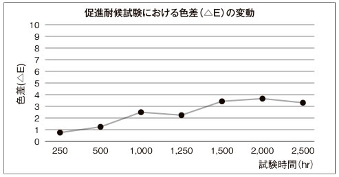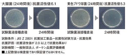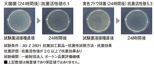 ※上記数値は試験値であり保証値ではありません。 ■EMウッドの耐候性試験(変退色評価) ![]() 試験条件 : キセノンアークランプ式 促進耐候試験機による促進試験 試験項目 : 2,500時間後の色差測定と目視(ブランクとの比較) ※ 250 時間=屋外暴露1年相当(2,500時間=10年相当) ![]() ※上記数値は試験値であり保証値ではありません。 ■EMウッドの抗菌性能 ![]() ■ERウッド組成表