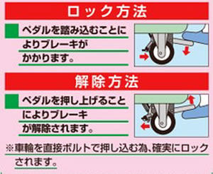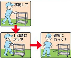 | 中量タイプ・フットブレーキ付き 堅牢・安全・美観、三拍子揃ったワゴンです。 均等耐荷重:150kg 棚板3段タイプ 支柱25.4φmm 棚板カラー:グリーン、パールホワイト、アイボリー、ダークグレー(半ツヤ) ![]() ■フットブレーキ操作方法 ![]() ■タイプ