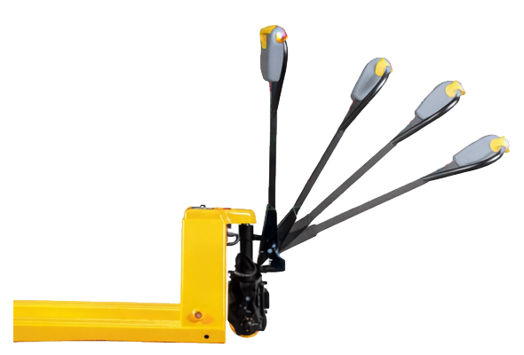 | スイッチ一つで電動走行・電動昇降可能なハンドパレット。 倉庫入り口のスロープ(6%)でも、1.5トンの荷物をらくらく移動可能。(無負荷時20%) ブラシレスモーター使用でメンテナンスフリー。 ![]() ■特長 ●自然な角度で快適ハンドリング 走行角度は25°~85°の安全設計。ハンドルを軽くて前に傾けるだけでスムーズに起動。 手を放して垂直に戻ると自動停止するため安全です。 ※0~25°、85°~90°ではブレーキがかかります。 ![]() ●作業中のトラブルを防止 走行中に警笛の音が鳴る仕様になっております。 周囲への警告として役立ち、また運搬時の衝突やトラブルを未然に防止します。この音は、装置が稼働していることを明示し利用者や周囲の人々に安全な操作を促します。 ![]() ●セーフティスイッチでの挟まれ防止 安全機能を誇る当社電動ハンドリフトは独自のセーフティスイッチを搭載し、走行中に押すだけで即座にブレーキが作動し逆進。簡単な操作性は、事故のリスクを最小限に抑えるだけでなく、作業全体の流れもスムーズに保ちます。 ![]() ●足への車両乗り上げ及び車輪等への接触防止 作業者の安全を守るため、床面とバンパーの隙間を25mm以下に設定し、足への接触リスクを極限まで減少させました。さらに、万が一の接触時にも衝撃を緩和できるよう、バンパーには厚さ10mm以上のゴム製素材を採用。硬い材質との直接的な衝突を防ぎ、現場の安全性を一層向上させています。 ![]() ■各部名称 ![]() ■仕様