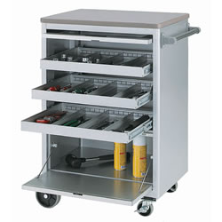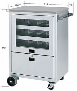 透明アクリル板(3mm厚)付きで、引出し内を外から見える事が出来ます。![]() ![]() ●天板はメラミン化粧合板(ソフトエッジ巻) ●サイドハンドル(左右取付可)付き ●引出し1枚当り均等耐荷重20kg ●引出し開閉ストローク349mm ●引出しの出し入れがスムーズなボールベアリング式スライドレール。 ●各引出しに仕切板3枚付き ●仕切板は25mmピッチで仕切り替えが出来ます。 ●カギ付き 〔上扉(ケント式・マグネット固定式)と下扉(スライドステー・マグネット固定式)を同時にロック〕 ●ウレタンキャスター(75 自在車ストッパー付2コ、125 固定車2コ) ●有効寸法 引出し(W509×D379×H120mm)×3段ロッカー(W486×D406×H210mm) ●キャスターが外に出ているので転倒しにくい。 ■使用イメージ これはイメージ写真です。通常引出しは2枚以上開けないで下さい。 (パソコン・マウス・コンセント・工具・スプレー缶は付いておりません。) 現場でノート・パソコンを使う時におススメ ※埃、オイルミストが多い場所では、お使いにならないで下さい。 ![]() ![]() ■寸法図 ![]() ■仕様