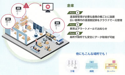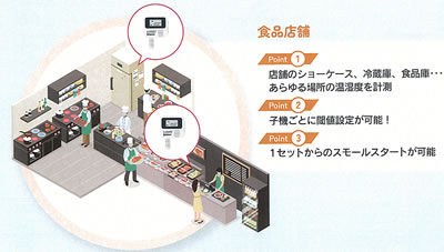 | ・導入しやすい低価格 ・Bluetoothを使ってスマホのアプリで温度湿度を確認可能 ・複数のロガーの情報を集約して手軽に見ることが可能 ・「e-WAVES Cloud」との連携※ ・通信可能距離100m以上の高い通信性能 (障害物がない環境での計測値) ※クラウドはAndroid版のみ対応しております ![]() ■簡単設置でその日から始められます。 ![]() ■食品店舗や倉庫など、さまざまな施設でご利用頂けます。 ![]() ■主な特長 ●低価格 クラウド利用料も含めてランニングコストが不要 最短1分間隔の計測データでリアルタイム温湿度管理を実現 ●長距離通信 専用設計により子機⇔親機の通信距離100m以上の高い通信性能を実現 ※障害物がない環境での計測値 ●簡単設置 持ち運び楽々 専用アタッチメント付きでどこでも簡単に取り付け 子機は電池型で給電不要 ■無線冷蔵庫用店舗工場倉庫用温湿度ロガーを使って一元管理 計測間隔1分 リアルタイム管理 ![]() ■トラックの輸送環境監視に トラック庫内のロガーから運転席のスマホまで通信可能。 温度、湿度、スマホのGPSを活用した位置データをスマホやクラウド※でリアルタイムにモニタリング。 ※クラウドはAndroid版のみ対応しております ![]() ■豊富なクラウド機能 ●異常アラート通知 閾値を逸脱するとメールでお知らせ。 温湿度は2段階通知で、変化をいち早くキャッチ ●HACCP/GDP準拠 温湿度をリアルタイムに計測し、グラフなどで確認可能。 操作ログやコメント機能も標準搭載 ●レポート作成 クラウドシステムのため、手書き管理が不要 ボタン一つで、改ざん不可のPDFレポート作成可能。 ■冷蔵・冷凍設備の定置監視に 近くにスマートフォンやタブレットを配置するだけで、計測データをクラウド※で確認。 離れた拠点のデータも簡単に集約・管理する事が可能。 ※クラウドはAndroid版のみ対応しております ![]() ■スマートフォン専用アプリ e-WAVES BLE App Bluetooth通信で受信した最新の計測データを、スマートフォン上で手軽に確認する事が出来ます。 シンプルな設計のため、登録したロガーの一覧表示や、グラフ化、データの出力等が直感的に操作可能です。 ![]() ■システム概要 ◎どこでも簡単データ確認 ロガーをご購入いただくだけで、専用アプリとクラウドシステム※が無料でご利用いただけます。 近くにロガーがある場合はアプリで、離れている場合はクラウドで、いつでもデータを確認する事が出来ます。 ※クラウドはAndroid版のみ対応しております ![]() ■各種通信によるデータ受信可否について