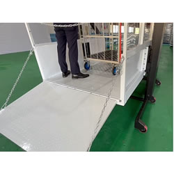 バッテリー式で様々な場面に対応する電動段差解消機。![]() ■特徴 電動走行、電動昇降 リモコン(無線)操作対応 バッテリー式 建築基準法の「昇降機」には該当しない ■台車のままラクラク積み込み!荷役作業の負担を軽減 トラックの荷台やプラットホームとの段差を解消することで、台車に載せたままスムーズに積み込み・積み下ろしが可能になります。 積み替えの手間が不要になり、作業者の身体的な負担や、ケガ・労災のリスクを低減。 作業時間も短縮し、効率を高めます。 ■バッテリー式で様々な場面に対応 バッテリー駆動のため、電源の場所に制限されることなく使用が可能です。 物流倉庫のプラットホームやトラック荷台、店舗のバックヤードなど、様々な現場で発生する段差を解消し、スムーズな荷役を実現します。 バッテリーは100V対応のため、一般的なコンセントで充電可能です。 ■資格・届出・設置工事は不要 移動式のため、建築基準法のエレベータには該当しません。 届け出や設置工事、使用にあたっての資格も不要のため、導入後すぐにご利用いただけます。 ![]() ■用途 物流倉庫:プラットホームやトラック荷台との段差を解消しての荷役作業。 小売店舗:店舗のバックヤードや、店舗間の商品移動時の段差解消。 工場:構内での段差のある場所での資材・製品の運搬。 ■仕様