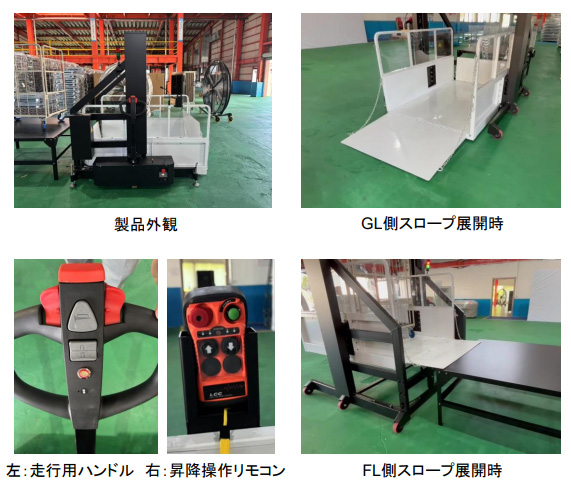バッテリー式で様々な場面に対応する電動段差解消機。![]() ■特徴 電動走行、電動昇降 リモコン(無線)操作対応 バッテリー式 建築基準法の「昇降機」には該当しない ■台車のままラクラク積み込み!荷役作業の負担を軽減 トラックの荷台やプラットホームとの段差を解消することで、台車に載せたままスムーズに積み込み・積み下ろしが可能になります。 積み替えの手間が不要になり、作業者の身体的な負担や、ケガ・労災のリスクを低減。 作業時間も短縮し、効率を高めます。 ■バッテリー式で様々な場面に対応 バッテリー駆動のため、電源の場所に制限されることなく使用が可能です。 物流倉庫のプラットホームやトラック荷台、店舗のバックヤードなど、様々な現場で発生する段差を解消し、スムーズな荷役を実現します。 バッテリーは100V対応のため、一般的なコンセントで充電可能です。 ■資格・届出・設置工事は不要 移動式のため、建築基準法のエレベータには該当しません。 届け出や設置工事、使用にあたっての資格も不要のため、導入後すぐにご利用いただけます。 ![]() ■用途 物流倉庫:プラットホームやトラック荷台との段差を解消しての荷役作業。 小売店舗:店舗のバックヤードや、店舗間の商品移動時の段差解消。 工場:構内での段差のある場所での資材・製品の運搬。 ■製品画像 ![]() ■寸法図 ![]() ■仕様