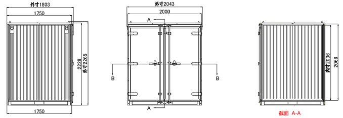 | 組立式の為、どんな場所にも設置可能。 クレーンでの搬入も出来ます。 ![]() ■特長 ●安心して屋外保管出来ます。(防水仕様) ●クレーン吊り、フォークリフト四方差し可能。 ※荷下ろしの際は長ツメのフォークリフトが必要となります。 ●堅牢で、盗難防止に効果は絶大。(施錠可) ●段積み可能(3段まで可) ●錆に強く断熱効果抜群。 ■寸法図 ![]() ![]() ![]() ■仕様