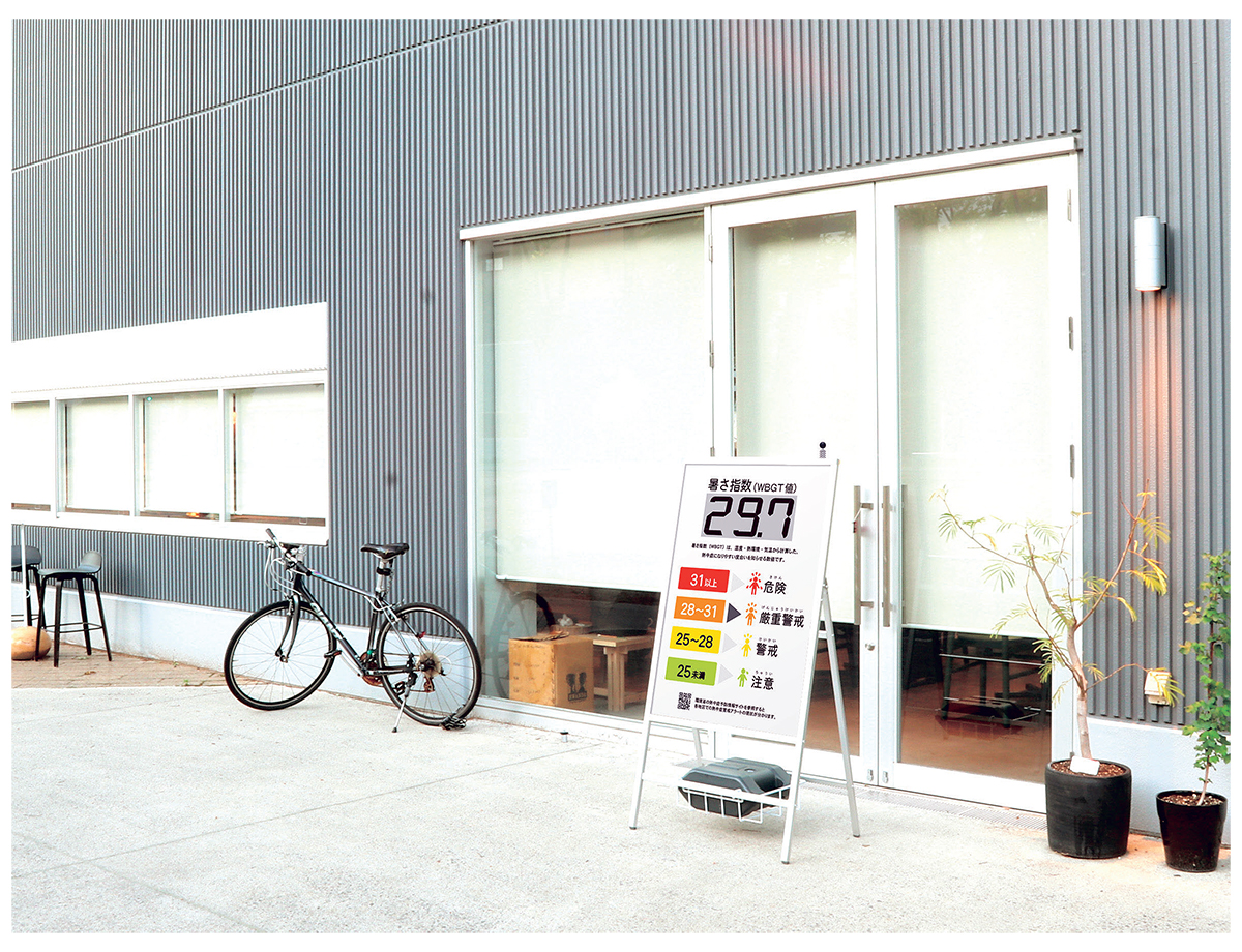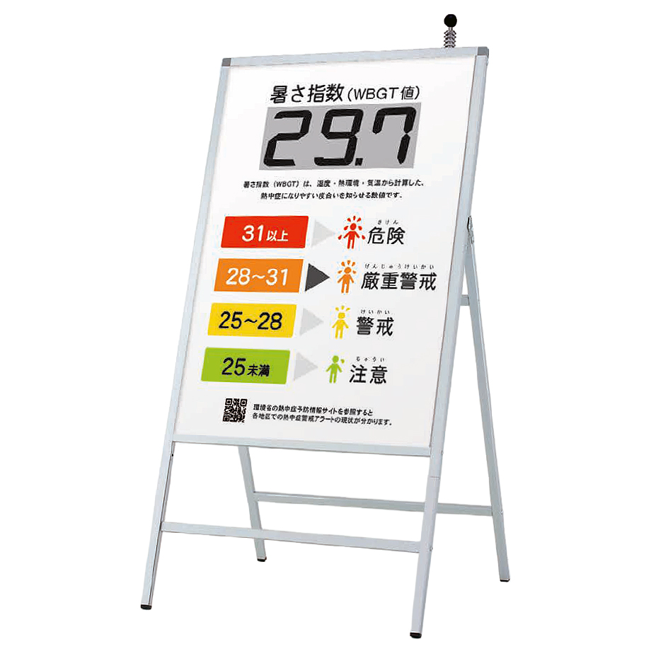 | 電子ペーパーで厚さ指数を掲示、コードレスでの設置が可能な熱中症注意喚起ボード。 暑さをしっかり可視化して熱中症になる前に避難。 熱中症の危険度合いを数字と説明で注意喚起できます。 ![]() ![]() ■特長 ●WBGT計センサー部 本体上部についたセンサーで計測します。(防滴カバー付) ![]() ●電子ペーパー センサーで計測した値をわかりやすい数値で表示します。 ●危険度表示 インジケーターで現在のWBGT値における危険度をわかりやすく伝えます。 ●コードレス仕様 ボタン電池式でコードレスなので、設置場所を選びません。 工事現場、イベント会場などで活用できます。 ![]() ■暑さ指数WBGT(湿球黒球温度:Wet Bulb Globe Temperature)とは? 人体と外気との熱のやりとり(熱収支)に着目した指標で、人体の熱収支に与える影響の大きい①湿度、②日射・輻射(ふくしゃ)など周辺の熱環境、③気温の3つを取り入れた指標です。 暑環境下での行動に伴うリスクの度合を判断するために用いられます。 ■使用例 ![]() ■タイプ
