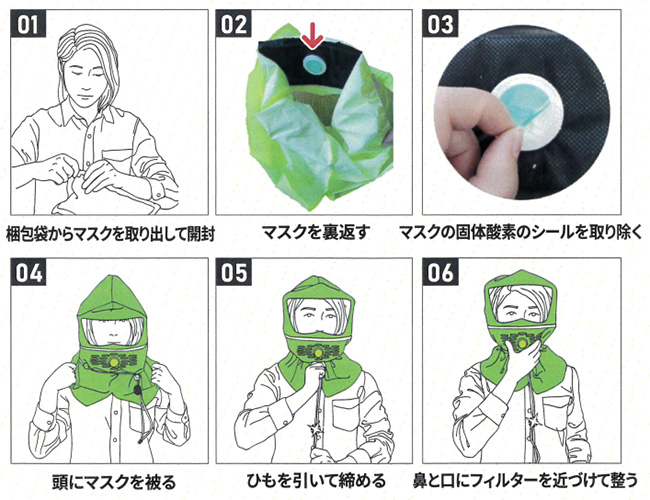 | 火災時の煙と有毒ガスから命を守ります ●活性炭フィルター (ACF) 5重LAYERで構成され、煙と有害ガスを除去 ●固体酸素パック 活性炭フィルターと一体型で持続効果は5分 ●自動点灯LEDランタン 締め紐と連結された絶縁チップが外され、自動点灯 ■特長 ●超軽量防炎素材 外形フードやその他の副資材は防炎素材で制作され、火気から着用者を守ります。 ![]() ●非常自動LED点灯 フードマスク着用時、コードロックを上げると非常ランタンが自動的に点灯され、救助者の識別/避難が容易です。 ![]() ●フィルターと固体酸素一体型 活性炭素フィルターと固体酸素の一体型で煙と有毒ガスをより強力に防ぎます。 ![]() ●一体型フード (老若男女誰でも使用可能) フードマスク着用時、一体型で連結されていた締め紐をワンタッチで締めることで時間の節約、緊急避難に役立ちます。 ![]() ■着用は簡単 ![]() ■ 仕様