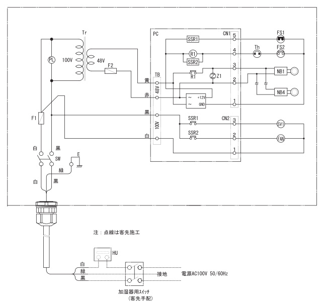 | きのこ栽培用 超音波加湿器 きめの細かい良質な霧できのこ栽培に最適な湿度環境をつくります。 耐湿構造により、きのこ栽培下における高湿度環境においても使用することができます。 きのこ栽培のほか、育苗、青果物の保管などの農業関係や、冷蔵倉庫に使用することもできます。 空運転の防止、水槽内の水温が上昇した際に運転を停止する安全機能が搭載されています。 ![]() ■外形寸法図・電気回路図