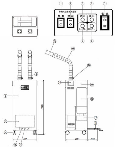 | 電気工事、配管工事不要の移動式超音波加湿器。 コンセントに差し込むだけで運転可能な小型の移動式超音波加湿器です。 加湿水槽内にUVランプを搭載しているので衛生的な加湿ができます。 ![]() 電気工事、配管工事が不要で、コンセントに繋ぐだけで運転ができ、360度あらゆる方向に噴霧することが可能。 UVランプを搭載しているので、衛生的な加湿をすることができます。 最大13L給水できるポリタンクを使用しているので、煩わしい給水の回数を減らすことができます。 渇水時や水温が上昇した際に、自動で運転を停止する安全機能を搭載しています。 ![]() ■UVランプ ![]() ■外形寸法図