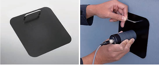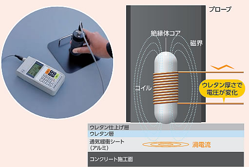 | ●厚膜測定用モデル(mm表示) ●専用渦電流式プローブ付属 ●ウレタン防水層から剥離しやすい圧力分散板付属 ![]() ウレタン防水層の性能を維持するために、工程内の膜厚管 理が重要な役割を果たしています。 面積あたりに必要な材料が十分であっても、塗りムラや下 地の起伏などが原因で局所的な膜厚不足が発生すること があります。 膜厚管理をすることで、脆弱な箇所を早期に発見し、最低 膜厚の確保を確実なものにします。 本器は、塗装現場で一般的に使用されている膜厚測定技 術を基にして、ウレタン防水のための新型センサを搭載した 膜厚計です。 通気緩衝工法※で施工されたウレタン防水層にセンサを押 し当てるだけの非破壊測定なので、表面を傷つけず、どなた でも簡単に測定できます。 なお、本器は、(一社)建築防水安全品質協議会ご協力のも と試験データを取得しています。 ※表面がアルミニウム製の通気緩衝シートを使用している場合に限ります。 ■圧力分散板 付属の圧力分散板は、測定する際のプローブ先端の圧力によるウレタン測定面の変形を防ぎます。 ![]() ■渦電流膜厚計の測定原理 本器の測定原理となっている渦電流膜厚計は、非磁性金属上の絶縁被膜を測定できます。 一定の高周波電流を流した誘導コイルを金属に近づけると、金属表面上に渦電流が生じます。 この渦電流は誘導コイルと金属面との距離に応じて変化し、そのため誘導コイル両端にかかる電圧も変化します。 この変化を電流値から読み取り膜厚に換算します。 ![]() ■仕様