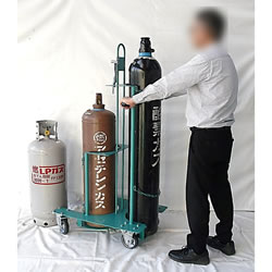 | 軽量、走行、安定、安全、安心 ●酸素、アセチレン(LP20kg)兼用 ●容器の入替、低床構造で楽四輪車 ●吊り上げて移動、高所作業にも便利 砂利場以外は高齢者や女性でも自在に動き移動もスイスイ ![]() ■使用イメージ ![]() ■仕様