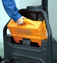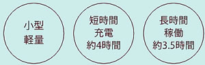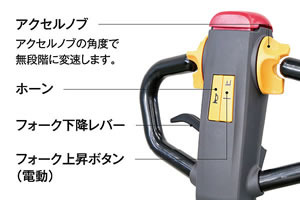 | 小型だから狭い場所でもラクラク運転。荷役作業の効率化が図れます。 クリーンで安全、しかもローコスト。作業環境を害さない経済車です。 ![]() ![]() ![]() 機能が充実した、コストパフォーマンス重視モデル。 低コストなのに最大積載荷重は1,500kg。 約3.5時間稼働のリチウムイオンバッテリー搭載し、約4時間で満タンになる高速充電にも対応しています。 バッテリーは脱着式。 予備バッテリーを用意することでバッテリー切れの心配を低減できます。 ![]() ■挟まれ防止スイッチ オペレーターが壁などに挟まれた時、挟まれ防止スイッチに触ると、逆発進し挟まれ事故を防止します。 ![]() ■アクセルノブ ![]() ■バッテリー残量計 充電の目安を確認できます。 ![]() ![]() ■リチウムイオンバッテリー 国内初!より安全性が高く、長寿命なリン酸鉄リチウムバッテリーを採用。 短時間充電、長時間稼働を実現しました。 バッテリーは簡単に 脱着でき、予備バッテリー(オプション)を準備すれば、さらに稼働時間を伸ばすことができます。 ※パターンサイクル稼働率100% ![]() ![]() ![]() ■寸法図 ![]() ■仕様