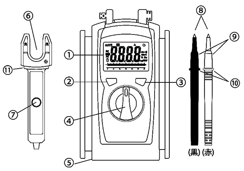 | 狭い箇所の電流もラクラク測定のクランプ付きデジタルマルチメータ。 ●交流電圧、直流電圧、交流電流、直流電流、抵抗、導通チェック、ダイオードテスト、コンデンサチェック、周波数測定、DUTYチェック の測定に対応。 ●クランプ最大測定導体径:φ12mm ●小型軽量手のひらサイズ。 ●テストリード先端はコンセント置くにも届く19mm。また接触不良の起こりにくい金メッキ処理を行っています。 ![]() ●背面に背面にクランプ、テストリードを収納できるデジタルマルチメータ ![]() ●オープンクランプで狭い箇所の電流もらくらく測定! ![]() ●金メッキテストリードを採用。 先端:19mm。プローブカバーは脱着可能。 ![]() ■各部名称 ●本体