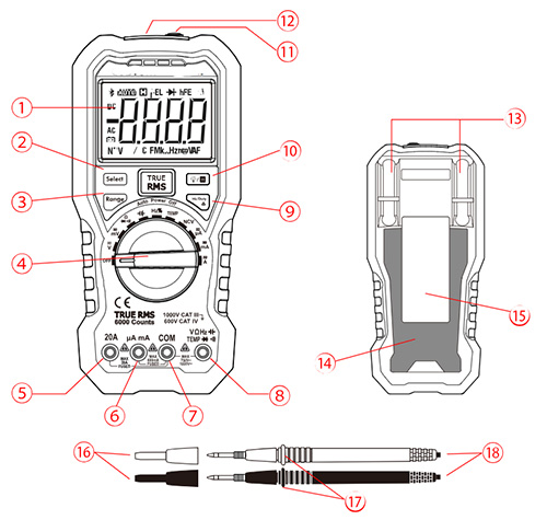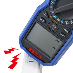 | CAT.IV対応で電力量メータにも使用可能な、様々な現場で活躍できる多機能タイプ。 ●電圧(直流、交流)、電流(直流、交流)、抵抗、周波数、静電容量、温度、導通チェック機能、ダイオードチェック機能。 ●真の実効値方式(True RMS)により正弦波以外の波形でも実効値の表示が可能。 ●その他、Dutyチェック機能、データホールド機能、相対比較機能。 ●バックライト付きで、暗い所での作業時も数値の確認がしやすい。 ●電池の消耗を防ぐオートパワーオフ機能を搭載。 ●非接触検電機能付(NCV)。 ●テストリードを背面に取り付けて収納可能。 ●暗い所で便利なLEDライトを製品先端に装備。 ●衝撃を緩和するホルスターケース付き。 ![]() ■特長 ●CAT.IV対応で電力量メータにも使用可能 IEC61010-1 CAT III 1000V、 CAT IV 600V に準拠しています。 ![]() ●LEDライトを製品先端に装備。 暗い所での作業時に便利。 ![]() ※イメージ ●非接触検電機能付(NCV) 本体上部の検知部を近づけ、交流電圧を検知したら、ブザーとLEDで知らせます。 ※検知電圧はAC90~1000V, 50~60Hzの範囲です。本機能は目安であり、正確な電圧を測定する場合は本器の交流電圧(ACV)測定機能をご使用ください。 ![]() ※イメージ ■各部名称