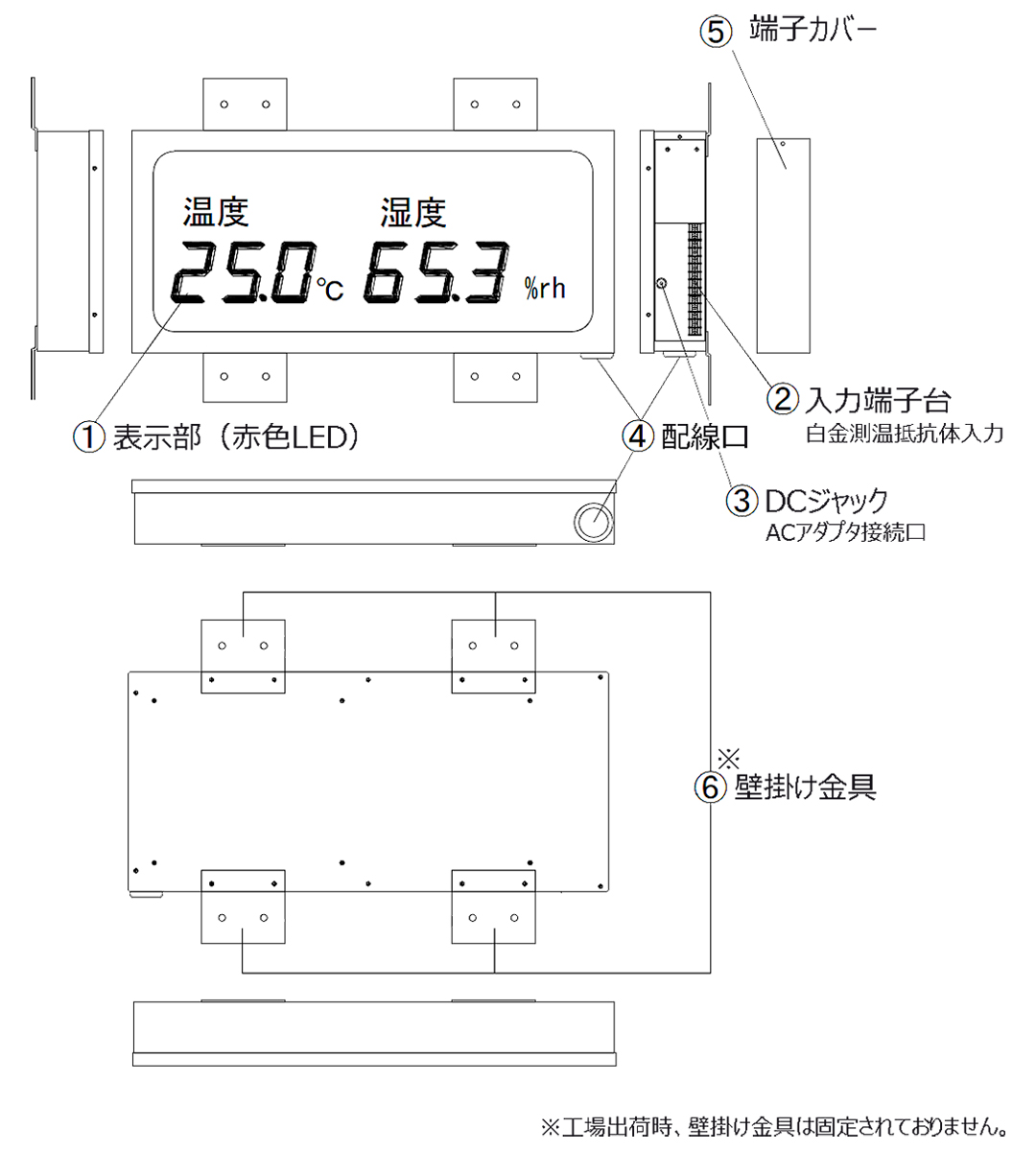 | ■特長 ●文字高約57mmのLEDを採用、温度と湿度を同時表示するデジタル温湿度表示器です。 ●入力はDC4-20mAに対応しております。 ●温湿度変換器SK-RHC-I(4-20mA)との接続が可能です。 ●壁取り付け型ですが、オプションで吊り下げも可能です。 ●MC15KM-571TRHI-9157は上下限警報機能付です。(※ブザー、回転灯などの接続が可能です。) ■各部名称 ![]() ■仕様