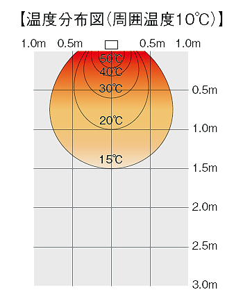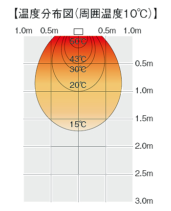 | ■特長 ●遠赤外線が体に吸収され、直接芯から温まるため、快適な温かさを実感できます。 ●灯油やガスなどの燃焼系とは違い、火を使わないので空気の汚れの心配や燃焼系の暖房器のように頻繁に換気に必要がありません。 ●わずらわしい灯油の補給が不要です。 ●使用環境に合わせて「縦向き」「横向き」が選べます。使い方に合わせていつでも簡単に変更が可能 ![]() ●耐久性の高いシーズヒーターを採用 作業現場などの厳しい環境にも最適です。また、鉄クロム線がヒーターパイプで包まれた構造なので衝撃に強く長寿命・高効率。 ●パイロットランプ搭載 通電状態が一目で分かり、消し忘れが防止できます。 ![]() ●仰角約45°まで調整可能 ![]() ■遠赤外線とは 遠赤外線はおよそ4~1000μm(マイクロメートル)の電磁波で、電磁波の中でも安全で有効なものの一部です。また直進性が強く、熱が物質に吸収されやすい特長をもっています。 ![]() ●温まりやすく冷めにくい 人の体には遠赤外線から発生する熱エネルギーの90~95%が吸収されるため、体の中から効率よく温まります。また速く温まるだけではなく冷めにくいという特長があるため、快適な空間を実現できます。 ●開放された空間にも 風の影響を受けないため、通気性の良い場所でも効果的に暖めることができます。 ■温度分布図(周囲温度10℃)