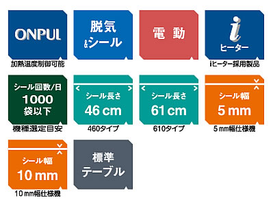 | 排気ファンとダクトフランジを標準装備。 排気用ホースを繋げて機械内部で発生した粒子を クリーンルームの外へ排出することができます。 加熱温度コントロール機能「=オンパル」を標準搭載、 駆動方式にメンテナンス性の高いソレノイド方式を採用。 使用環境や用途に応じて真空源の選択、ノズルストロークの変更が可能です。 ![]() ![]() ※この製品は製品駆動用・脱気用エア源のご準備は不要です。 本体側面に排気ファンとダクトフランジを装着。 排気用ホースを繋げて機械内部で発生した粒子をクリーンルームの外へ排出することができます。 理想の加熱温度を設定・維持できる加熱温度コントロール機能「=オンパル」を標準搭載し、駆動方式にメンテナンス性の高いソレノイド方式を採用(駆動用・脱気用エア源のご準備は不要です)、メンテナンス性向上だけでなく、お客様の設備維持やシーラーのメンテナンス費用など、トータル的なコストを低減します。 ソレノイド方式は、確実な脱気シーリング・脱気包装をコンパクトボディと簡単操作で行うことができます。 また、ユーザー様の使用環境や用途に応じて真空源の選択、ノズルストロークの変更が可能です。 ■集中排気ダクトフランジ、排気ファンを装備 本体側面に排気ファンとダクトフランジを装着していますので排気用ホースを繋げて機械内部で発生した粒子をクリーンルームの外へ排出することができます ![]() ■用途・特長:卓上型・電動脱気シーラー 操作方法:電動・ソレノイド駆動 包装形態:シール専用&脱気 機種選定目安使用回数/日:電動・エア駆動=1000袋以下 袋サイズ(最大):46 cm以下 包装可能な包材(2枚以上あわせての合計): ●片側加熱仕様機 PE : 0.4 mm、 PP : 0.3 mm、 NY : 0.3 mm、 PVA : 0.3 mm、 その他ラミネート:0.4 mm ●上下加熱仕様機 PE : 0.6 mm、 PP : 0.4 mm、 NY : 0.4 mm、 PVA : 0.4 mm、 その他ラミネート:0.5 mm ■真空源の選択ができます。 使用用途や環境に応じて「標準タイプ」「簡易脱気タイプ」「高速度脱気タイプ」の3タイプ ■ソレノイド駆動を採用 設備費用を軽減し、メンテナンス性を向上 シール駆動機構にはエア駆動ではなく電磁石を活用した「ソレノイド駆動」方式を採用しました。 製品駆動用にエア源をご準備いただく必要はございません。 ソレノイド駆動方式を採用することにより、エアを供給する為の「外部エア配管設備費用」が不要ですのでお客様の設備維持やシーラーメンテナンスなど、トータル的なコストの低減にもお役に立てると考えております。 ■ i ヒーターを採用 熱膨張の少ないiヒーターを採用し、ヒーターの中折れを軽減。 ヒーターと接触する温度センサーなどの周辺部品の高寿命化を図りました。 i ヒーターについてはこちらのページもご覧ください。 ■ノズルストロークが調整可能 縦長の袋に対応できるよう脱気ノズルのストロークを10~80mmまで10mm刻みで8段階の調整が可能です。 ![]() ■加熱温度コントロール機能標準装備 ・シール加熱温度:60~250 ℃ ・シール冷却温度:40 ℃~シール加熱温度の範囲 理想的なシール条件が設定できます オンパルシステム最大の特徴は理想的なシール条件を設定できることです。 加熱温度設定は、高感度の温度センサーによる温度管理とマイコンによる制御によって行われます。 気温や機械温度の上昇に左右されることなく、フィルムが溶ける温度に加熱温度を設定・維持できますので、電力消費に無駄が無く、シール精度を向上させることができ、ヒーターなどの部品消耗を抑えることができます。 ■簡単操作のマイコンコントローラー 作業方法・脱気方法の選択および設定などのシール条件の設定にはマイコンコントローラーを採用しています。簡単なタッチパネルを押す操作で設定を行うことができ、設定した内容は都度、液晶画面で確認することができます。 コントロールユニットで設定したシール条件は電源OFF後も保持され、再度電源ONした時にそれまでのシール設定値が再現されます。 ![]() ■多様な包装資材に対応 加熱方式は以下の2仕様があり、多様な包材に対応します。 ・片側加熱仕様機・・・・厚さ0.3 mm(重ね合わせ合計数値)までの包材に対応。 ・上下加熱仕様機・・・・厚さ0.4 mm(重ね合わせ合計数値)までの厚手袋、ラミネート袋に対応。 上下加熱仕様機は、厚手袋やガゼット袋などにも対応し、ガスバリア性包材に脱酸素材を封入することで保存期間を延ばすことが可能です。 ■4種類のシール方法に切り替え可能 以下の作業方法、脱気方法の選択を組み合わせることで4種類の作業パターンを行うことが可能です。 包装内容物の特性や包装仕上がりのニーズに合わせて作業パターン=シール方法の選択ができます。 ▼ 作業方法の選択肢 1脱気 + シール 2シール専用 ▼ 脱気方法の選択肢 1真空計 2脱気タイマー 3マニュアル操作 ●4種類の作業パターン 1シールのみ 2脱気:マニュアル(目測)+ シール 3脱気:タイマー + シール 4脱気:真空計 + シール ■最多10種類の作業パ