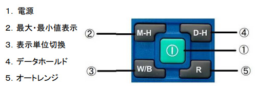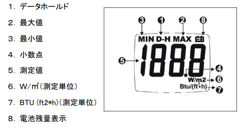 | ●太陽光に関する様々な測定に ●2つの単位表示(W/㎡、Btu/ft2*h)の選択が可能 ●データホールド、Max、Min表示機能、ゼロ調整機能、オーバーレンジ表示 ●分解能 0.1W/㎡ ![]() ■各部の名称 ●ディスプレイ ![]() ●ボタン ![]() ■測定の準備(電池の交換) 電池カバーを外し、006P(9V)電池を極性に注意して接続し、ホルダーに格納します。 カバーはしっかり固定してください。 <ご注意> 乾電池の消耗マーク が表示されましたら、速やかに新しい乾電池と交換してください。 ■ボタン及び機能の説明 (1)電源ボタン 電源の ON/OFFをします。 (2)最大・最小値表示ボタン 1秒以上長押しすると最大値が表示されます。 再度ボタンを押すと最小値が表示されます。 ボタンを長押しすることにより最大・最小値表示機能を解除します。 (3)W/㎡ ・BTU(ft2*h)切り替えスイッチ “電源”ボタンを押して測定モードにして下さい。 画面にはBTU(ft2*h)が表示されます。 “オートレンジ”ボタンを押すと単位が Btu(ft2*h)からW/㎡に切り換ります。 もう一度押すと再度切換ります。 (4)DーH(データホールド)ボタン “DーH”ボタンを押すとデータホールドモードになります。 “D-H”シンボルがディズプレイに表示され測定値が保持されます。 もう一度ボタンを押すと、ホールド機能を解除します。 (5)オートレンジボタン “電源”ボタンを押して測定モードにしてください。 もし“19.9”より大きな値が測定されディスプレイに“OL”が表示されたときは、最適な測定レンジを選択するためボタンを押してください。 ■測定手順 (1)本体上部を手などで覆い、光が入らない状態にしてもディスプレイに数値が表示される時は、本体右側面にあるゼロ調整ボリュームにて数値が“0.00”になるように測定してください。 (2)測定器を太陽光に向けてください。 (3)ディスプレイに放射照度値が表示されます。 ■仕様