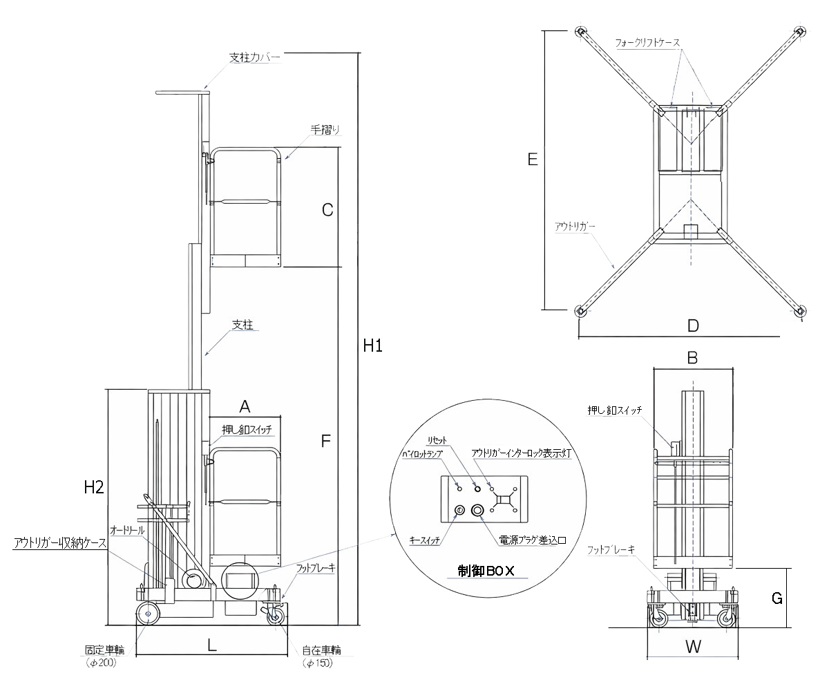 | ■特長 ●軽量化によるスピーディーな作業を実現 ●バケットは下側にあるため、乗り込み等が楽にできます。 ●安全装置として、アウトリガーのインタロック装置を有しています。アウトリガーをジャッキアップしないと昇降致しません(転倒防止策)。 ![]() ●停止位置にて固定できるようフットブレーキを装備しています。 ![]() ●車輪はウレタン車を使用、床面を傷つけたり汚したりいたしません。 ●当商品は平坦地使用です。斜路、勾配のある場所では使用できません。 ●耐久性のある部材を使用、品質に優れ耐久性があり、大変経済的です。 ●軽量、コンパクト、スムーズに移動でき、エレベータに楽に出入りできます。 ●フォークリフトケースを装備、フォークリフトを使用しての運搬移動ができます。 ![]() ■寸法図(単位:mm) ![]()