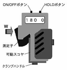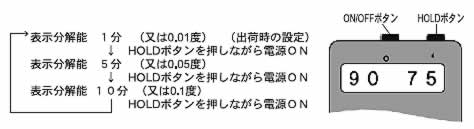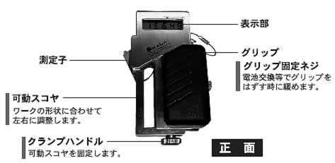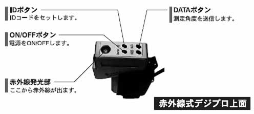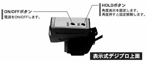 | ■使用上の注意 ●精密測定器であり、落としたり、強い衝撃を与えないで下さい。 ●湿気やほこりなどの多い場所での使用、及び保管はさけて下さい。 強い磁気のある場ノヲテでの使用、及び保管はさけて下さい。 ●測定子の円弧部分に触らないで下さい。 黒い部分は磁気テープ゜です。 キズついたり、強い磁気を近づけると、角度測定ができなくなります。 ●本体に水や油が付着しないようにして下さい。デジプロ内部に水や油が入り込むと故障の原因になります。 ●なるべく20℃に近い、温度が一定の場所でご使用下さい。 ●汚れは乾いた布、中性洗剤、アルコールなどで軽く拭き取る程度にして、シンナーなどの有機溶剤は使用しないで 下さい。 ●使用後は、専用木箱にしまって下さい。 <赤外線式デジプロの場合> ●赤外線受光器は、直射日光や強い光が当たらない場所に設置して下さい。 ●赤外線投光部・受光部は、汚れ・キズ等に注意して下さい。 赤外線通信ができなくなります。 ■各部の名称と機能 ![]() ![]() ![]() ■測定方法 @電源の入れ方 測定子をWの方向に押さえつけながら、ON/OFFボタンを押して電源を入れます。 電源を入れると、”180 0”が表示されます。 ![]() A測定 ワークに合わせて可動スコヤを調整して測定を行って下さい。 その時、クランプハンドルをしっかり締めて、ワークを可動スコヤ及び測定子に密着させるように測定して下さい。 ![]() ![]() Bホールド機能 HOLDボタンを一度押すと、表示された角度を固定する事ができます。 測定しにくいワークの角度を測るのに便利です。 再度HOLDボタンを押すと表示角度の固定が解除できます。 C電源の切り方 ON/OFFボタンをもう一度押すと、電源が切れます。 ※測定子を静止させていると、約6分間で自動的に電源が切れます。 ■ここからは、赤外線式の使い方です。 D測定データの送信 DATAボタンを押すと測定データを受光器に飛ばすことができます。 受光器の受光ランプが赤く点灯します。 HOLDボタンで表示角度を固定してから飛ばすと確実です。 ![]() ■表示について @角度表示 電源を入れると、測定角度を表示します。 出荷時は、60進(糖分)表示ですが、グリップ内部の選択スイッチで、10進表示に切り替えることができます。 ※赤外線式でAMNCに測定データを送信する場合、60進(度分)でお使い下さい。 →2.各部の名称と機能を参照して下さい。 ![]() ![]() A角度表示分解能 HOLDボタンを押しながらON/OFFボタンで電源を入れると、測定角度の分解能を切り替えることができます。 ![]() Bエラー表示 測定中、測定子を速く廻すと、"Err"が表示されます。 この時は、一旦電源を切り、再度電源を入れて下さい。 Cバッテリーアラーム表示 動作電池の容量が少なくなると、バッテリーアラームの表示になります。 ON/OFFボタンで電源を切る事が出来ません。 この時は、全て新しい電池に交換して下さい。 ■仕様