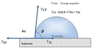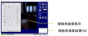 ■接触角 接触角算出公式として多くの分野で国際的に最も用いられている接触角測定モデルyoung公式に基づくATAN1/2θ法により水滴画像の座標 解析から接触角を算出いたします。 ![]() ■専用画像演算ソフト