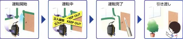 | ■特長 ●強力 プラズマ、オゾン、触媒技術の組み合わせにより、多彩なニオイを強力脱臭。 オゾン発生量12,000mg/hの大容量 ●早い 30m3の部屋ならば、わずか20分で脱臭。オゾン回収・分離機能付きでスピード復旧。 ●安全 薬品、薬剤を使わず、全自動、無人で脱臭作業を実施。 オゾンは自然分解するため残留性もありません。 ●移動式 車輪付きで移動が簡単。 様々なシーンで活用できます。 ■3つのステップで強力脱臭