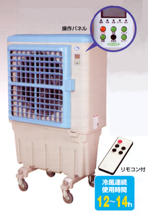 吹出し口で外気温より-4℃の冷却効果 中型・大型冷風機 氷を入れればさらに涼しく 冷風扇はエアコンのようにフロンを使用せず、廃熱を出しません。 水の気化熱による自然の冷却効果を利用した地球環境にも優しい機器です。 また涼しい風を送るので、長時間当たっても疲れません。 風量調節/3段階 風向調節/上下手動・左右自動 業務型・屋内型 ON・OFFタイマー付き リモコン付き 50Hz用 60Hz用 |