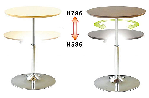 | 天板が360°回転するリフトテーブル ※天板の固定はできません。 ![]() ■特長 食事の際、椅子の座面高さからテーブルの天板高さ差は約27cm~30cm程度のものが最適とされております。一般的なダイニングチェアは座面高さが約40cm程度のですので、最適なテーブルの高さは約70cmとなります。 一方、座面の低い姿勢で寛いだりするソファーなどは座面とテーブルの高さ差は約10cmとされております。また、カフェのようにソファーでの食事をする場合テーブルの天板高さは25cm程度が最適とされています。 用途に合わせて簡単に天板高さを自由に調整できるガスシリンダーテーブルは1台で様々なシーンでご使用いただけます。 ![]() ■タイプ
