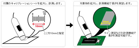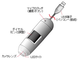 ■様々なシチュエーションに対応しております。 自由研究、工場での検品、検査など幅広いシチュエーションで使用できます。また、使用方法はとてもシンプルで、本体のダイヤルを回せば、どなたでも簡単にピンと調整する事が可能です。 ![]() ■静止画・動画の撮影が可能 付属の専用ソフトを使用する事で、ワンタッチで静止画・動画の撮影を行う事が可能です。 ■約500倍に拡大可能 本体のダイヤルを回すことで約500倍に拡大時のピント調整をすることが可能です。 ![]() ■USB端子をパソコンに接続、ソフトをインストールすればすぐにお使い頂けます。本体のダイヤルを回すことでピントを調整します。また、マイクロタッチボタンをクリックする事でワンタッチで撮影可能です。 ![]() ■シンプルで使いやすいソフトが付属 ![]() ■計測機能